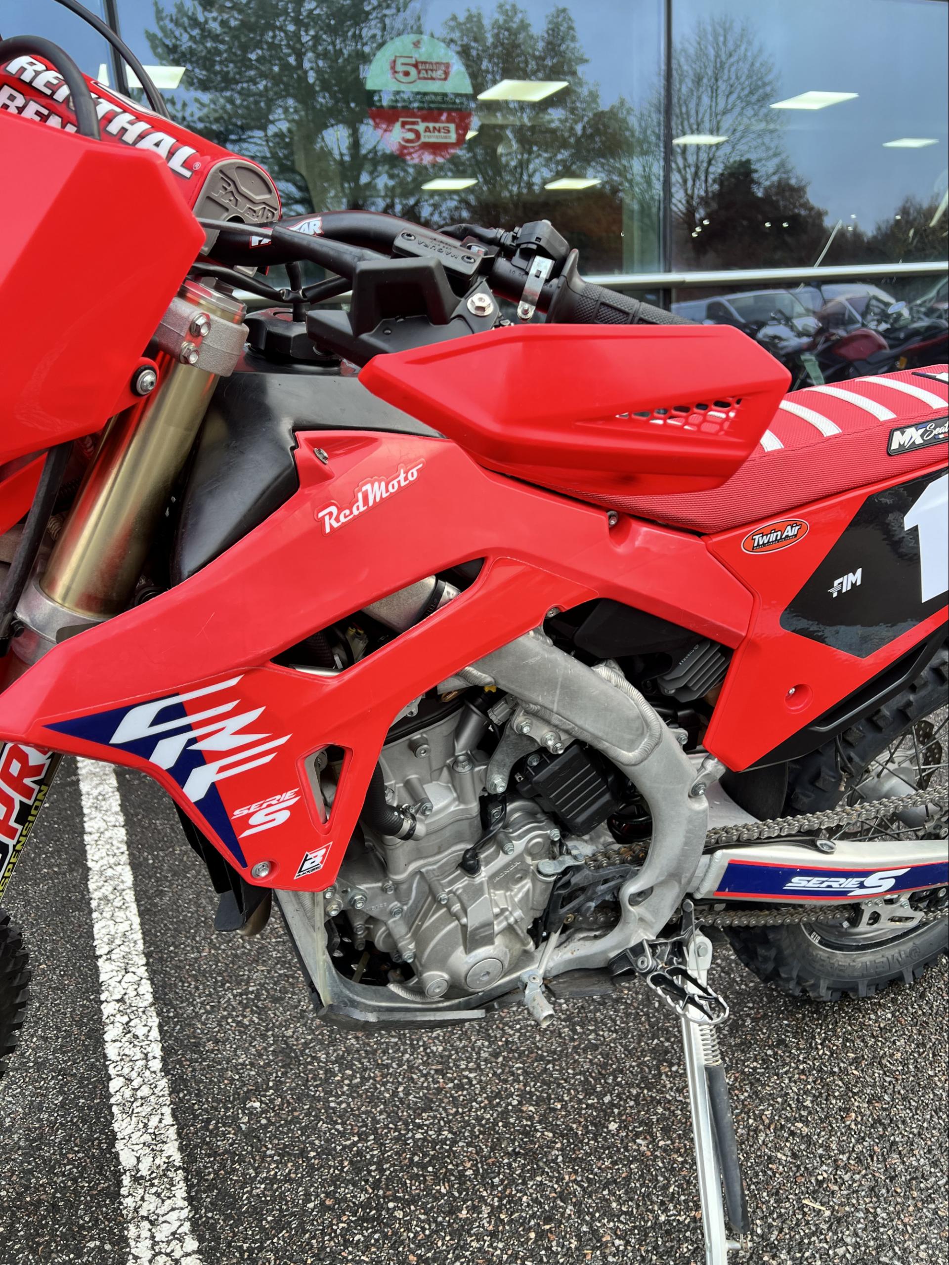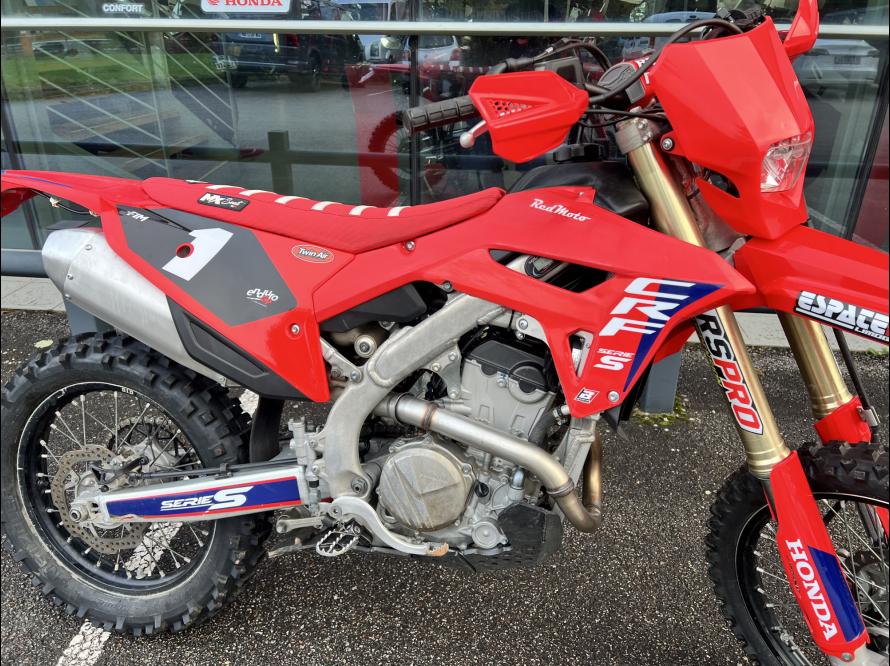 les modèles CRF-RXR sérieS sont des versions encore plus abouties avec quelques équipements spécifiques en supplément. Voici les millésimes 2025 avec nouveau conduit d’admission et nouvelle commande du corps d’injection, associés à un nouveau mapping. Elles s’équipent d’un embrayage hydraulique Magura, d’un compteur d’heure, d’un sabot AXP Extrem et le faisceau électrique est simplifié.